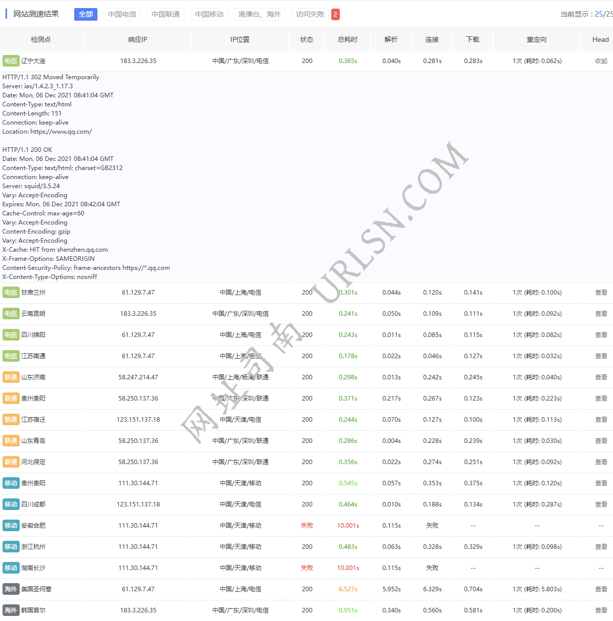 该应用可从各地区、各线路发起 IPv4 HTTP 速度测试,可分析:解析/连接/重定向/SSL/状态码/Head信息等。
