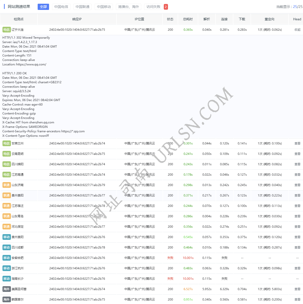 该应用可从各地区、各线路发起 IPv6 HTTP 速度测试,可分析:解析/连接/重定向/SSL/状态码/Head信息等。