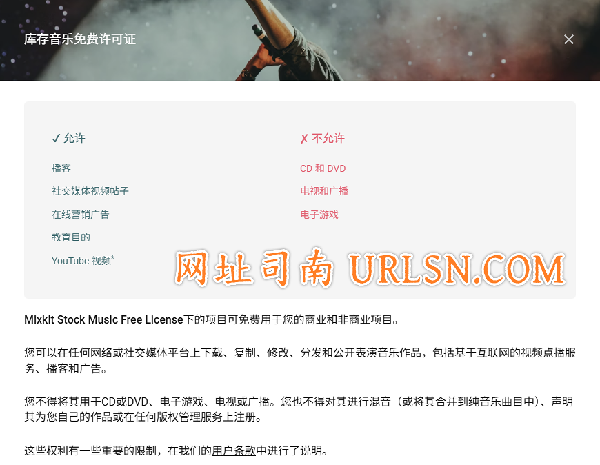 注意:您不得在 CD、DVD、视频游戏或电视和广播中使用 Mixkit 音乐。