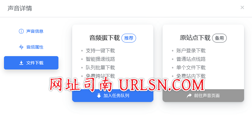 点击下载会显示前往音频蛋下载和原站点下载。音频蛋下载需要充值,原站点下载就是前往该资源原始页面,比如跳转到hlooperman.com等,这些海外网站没中文,需要注册,但完全免费。